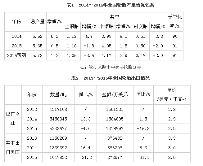 近年來,輪胎行業(yè)在調整中前行,全鋼子午線輪胎產量連續(xù)兩年下降,半鋼子午線輪胎產量微增長,斜交胎產量持續(xù)下降。全國輪胎產量情況見表1。產品出口大幅下滑,主要是受到美國等國家對我國輪胎實施的“雙反”等貿易壁壘的影響。2001~2016年2月共發(fā)生貿易摩擦案件21起,嚴重影響了我國輪胎的正常出口。近3年全國輪胎出口情況見表2。