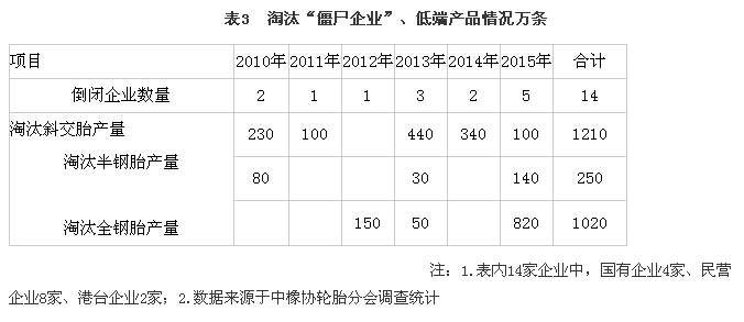 主要表現在3個方面:一是2010~2015年輪胎行業(yè)先后淘汰“僵尸企業(yè)”14家、低端產品2480萬條,見表3。