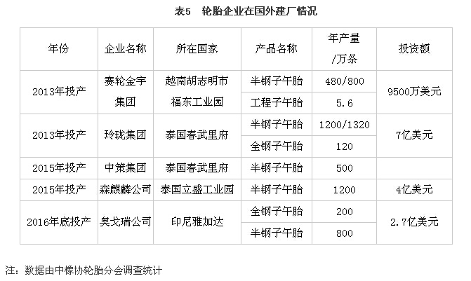 三是輪胎企業(yè)“走出去”在海外建工廠,由產品出口轉為技術、品牌輸出。開展國際化經營,可以規(guī)避貿易摩擦。2013~2016年輪胎企業(yè)在國外建廠情況見表5。