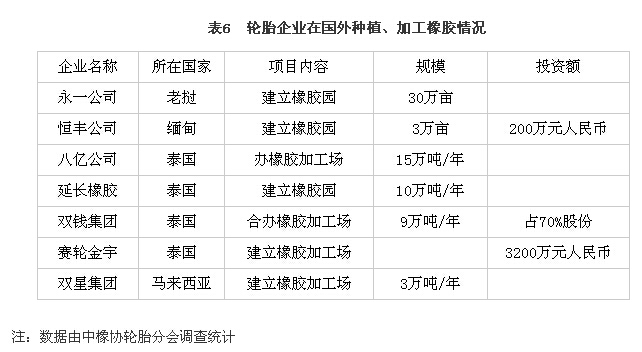 四是由于國內天然橡膠資源嚴重短缺,國產膠供給量不到20%,因此有部分輪胎企業(yè)先后到國外種植和加工橡膠,見表6。