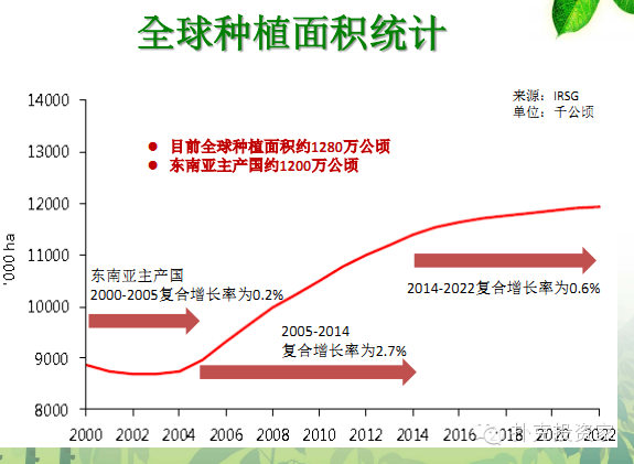 全球種植概況目前全球總種植面積約1280萬(wàn)公頃,其中東南亞約1200萬(wàn)公頃;