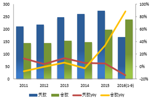我國天膠與合成膠進(jìn)口量(單位:萬噸)